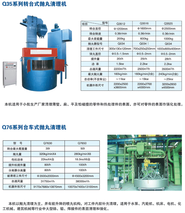 Q35系列和Q76系列的轉(zhuǎn)臺(tái)式拋丸清理機(jī)如下: