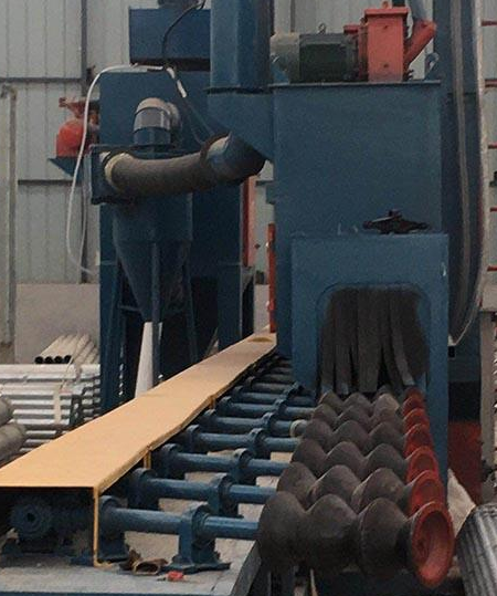 鋼管拋丸機適用于成批鋼管在焊接或涂裝前對其外表面連續(xù)進行拋丸處理,徹底進行除銹,除氧化皮和其他污垢物,是管道清理方面的專家。經(jīng)過拋丸處理,使之獲得一定粗糙度的光潔表面,增加噴涂附著力,提高表面質(zhì)量與防腐效果。其卓越的清理性能讓過去勞動力密集的噴砂和電線刷的方法成為過時。同時,鋼管拋丸機能將生產(chǎn)成本將至低,且大大提高產(chǎn)出。