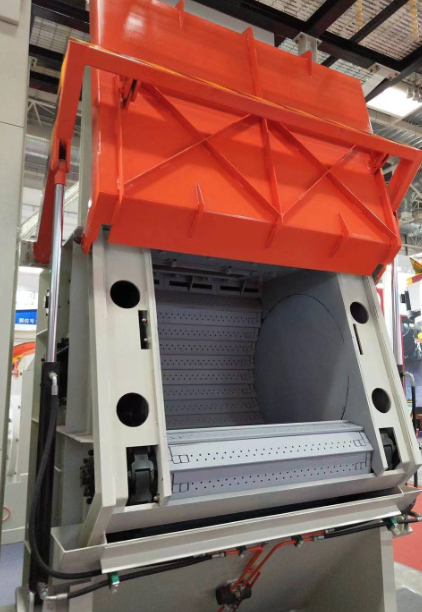 第五點(diǎn):拋丸器完全停止后,打開(kāi)加料門(mén),將工裝及工件吊出。